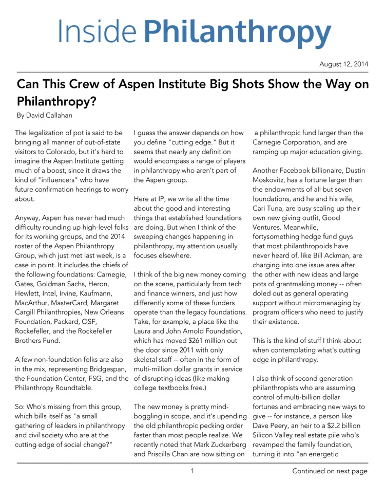 Can This Crew of Aspen Institute Big Shots Show the Way on Philanthropy?